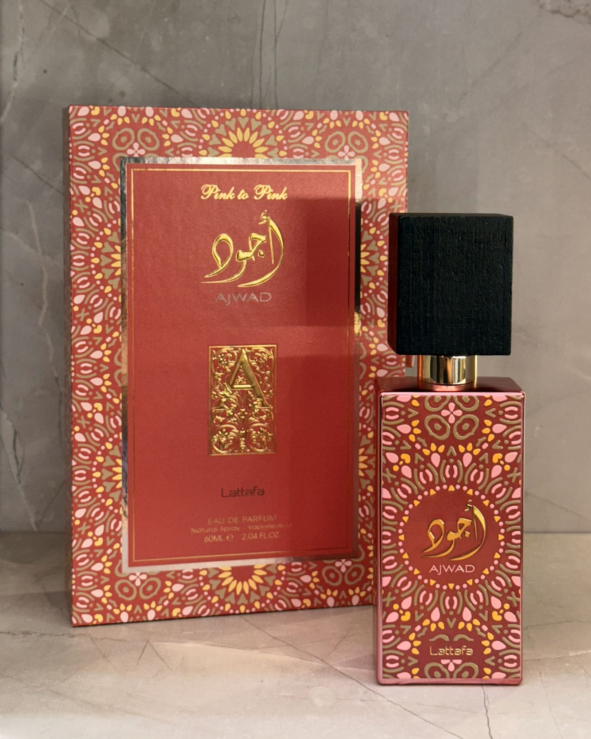 Ajwad Pink to Pink de Lattafa Perfumes es una fragancia de la familia olfativa para Hombres y Mujeres. Esta fragrancia es nueva. Ajwad Pink to Pink se lanzó en 2024. Las Notas de Salida son guayaba, toronja (pomelo) rosada, lichi y pimienta rosa; las Notas de Corazón son rosa, peonía y magnolia; las Notas de Fondo son cuero, almizcle, ámbar gris, vainilla y musgo.