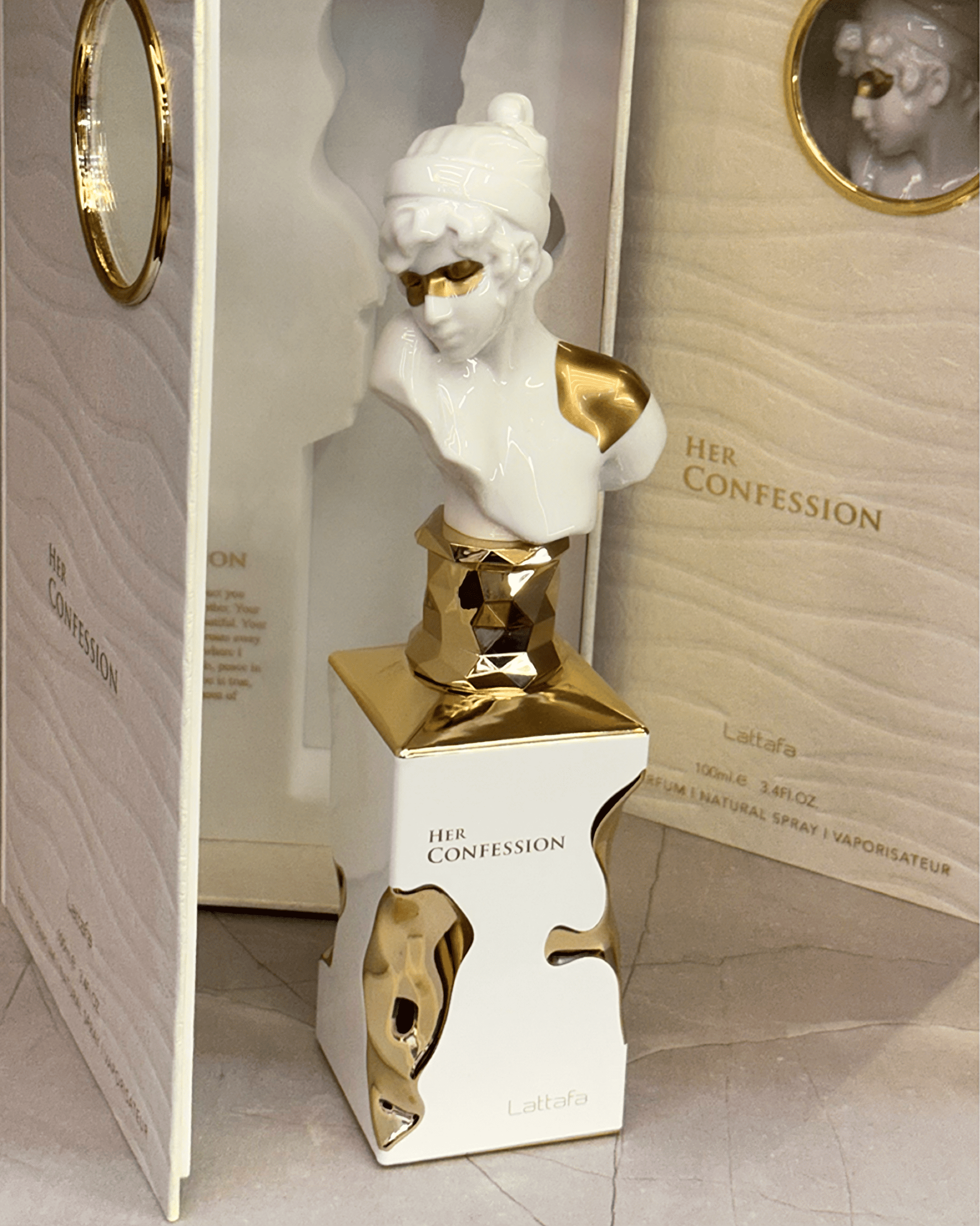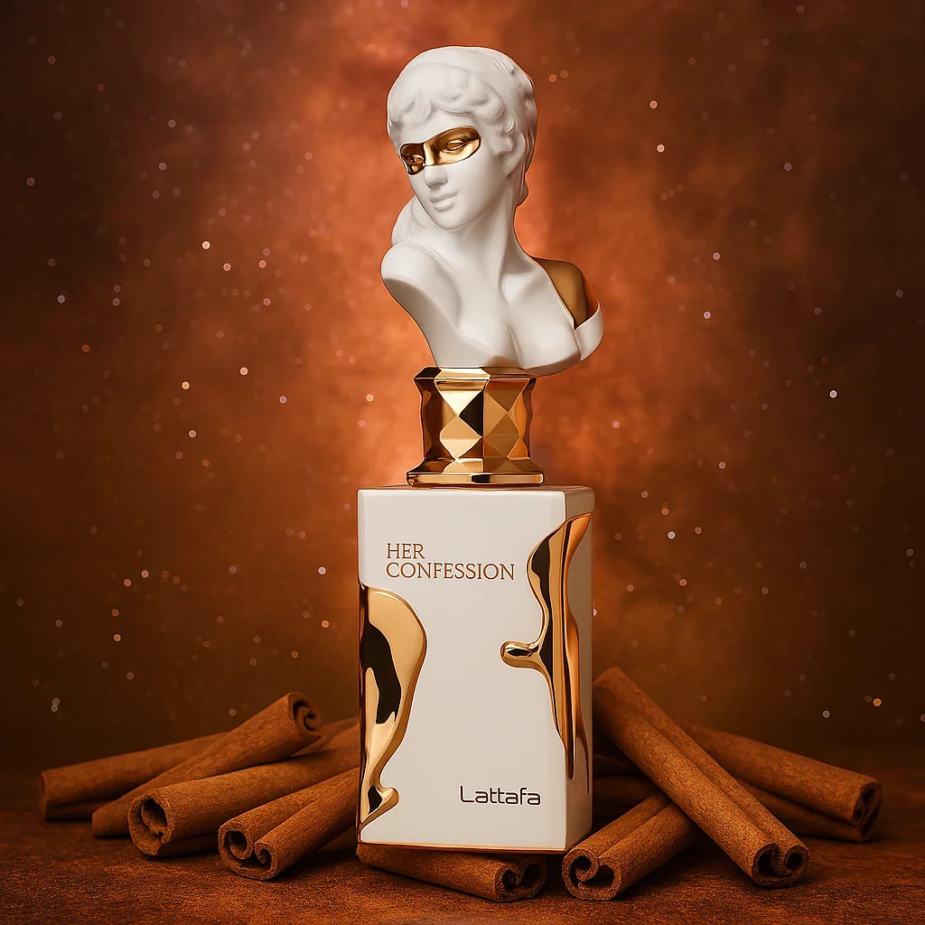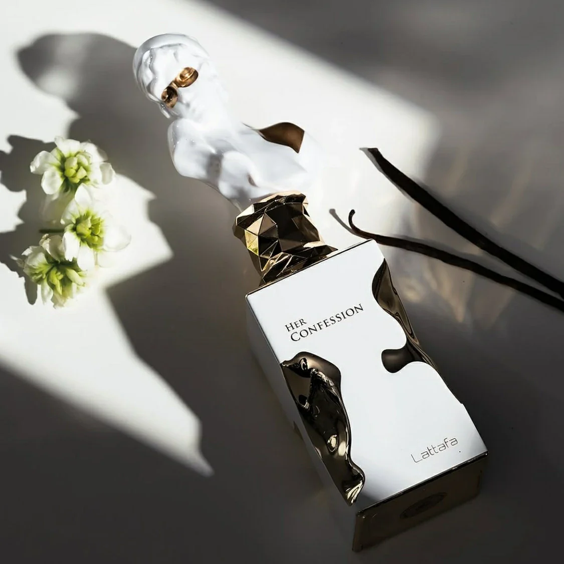 Her Confession de Lattafa Perfumes es una fragancia de la familia olfativa para Mujeres. Esta fragrancia es nueva. Her Confession se lanzó en 2024. Las Notas de Salida son Místico y canela; las Notas de Corazón son nardos, incienso, jazmín y Mahonial; las Notas de Fondo son vainilla, haba tonka y almizcle.