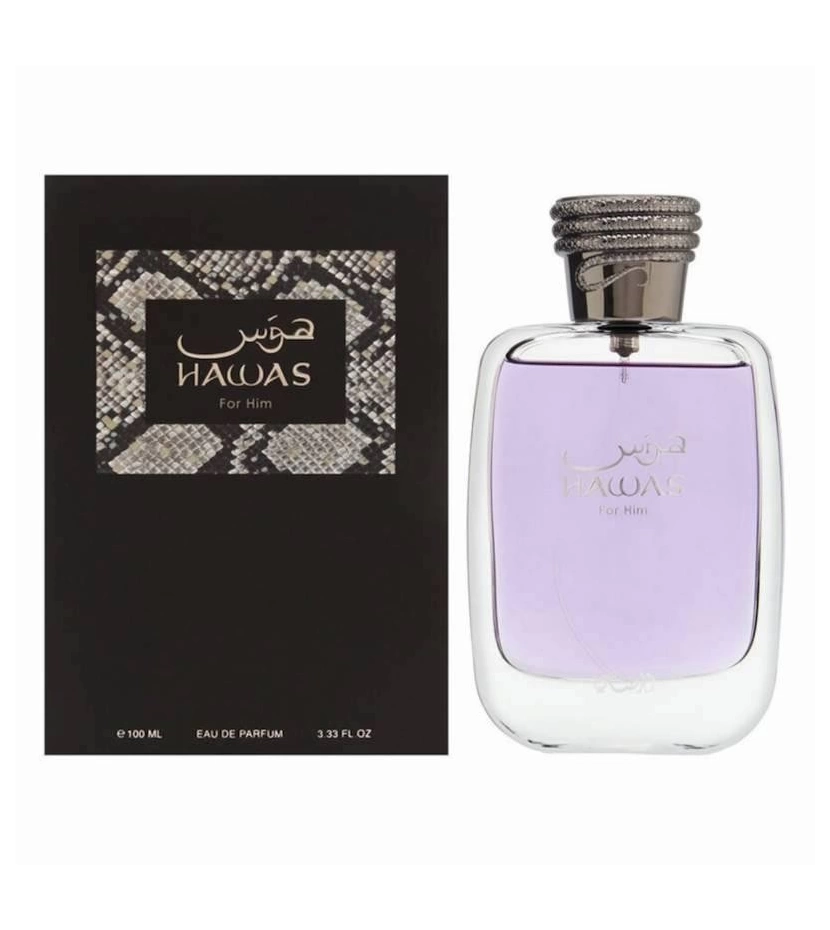 Hawas for Him de Rasasi es una fragancia de la familia olfativa Aromática Acuática para Hombres. Hawas for Him se lanzó en 2015. Las Notas de Salida son manzana, bergamota, limón (lima ácida) y canela; las Notas de Corazón son notas acuosas, ciruela, cardamomo y flor de azahar del naranjo; las Notas de Fondo son ámbar gris, almizcle, pachulí y trozos de madera a la deriva.